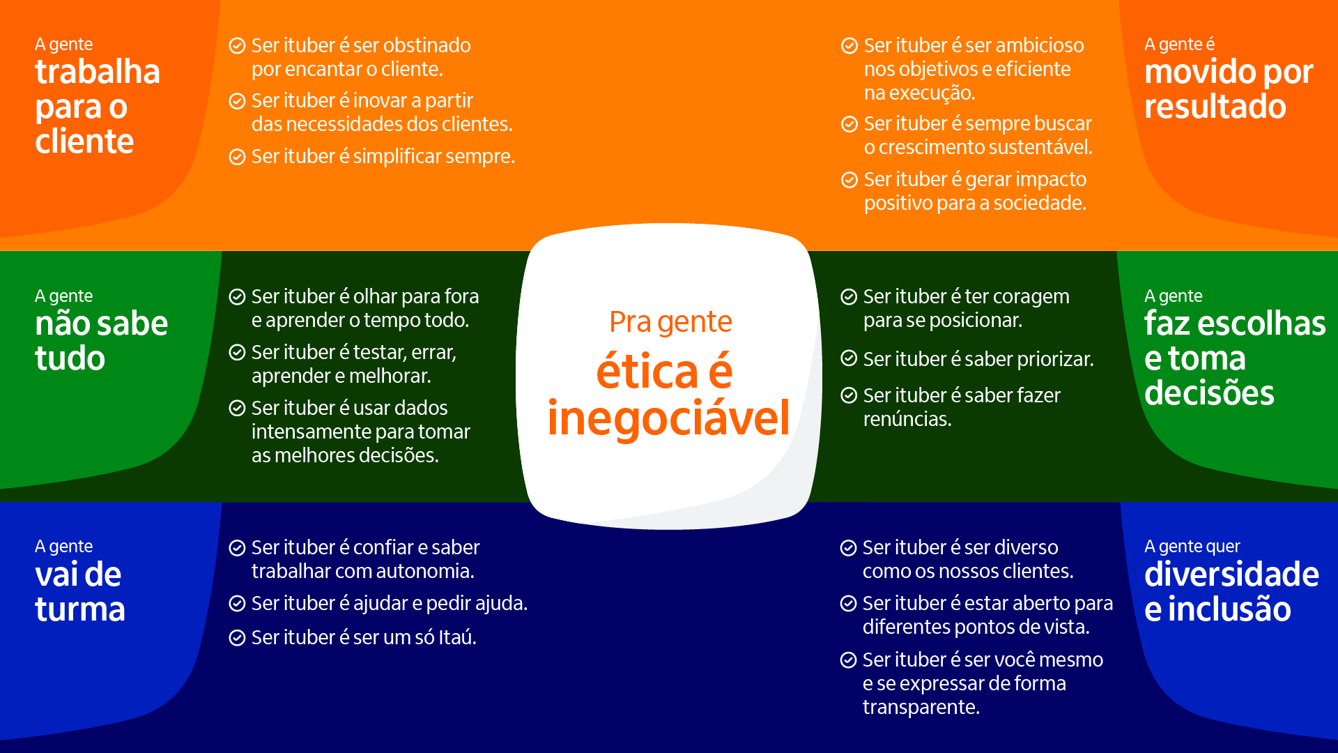 A cultura itubers é o conjunto de valores e práticas que norteiam e inspiram o comportamento das pessoas colaboradoras do Itaú Unibanco em diversos aspectos: sentimentos, percepções, comportamentos, ritos, entre outras questões compartilhadas, que moldam o nosso ambiente corporativo como um todo.