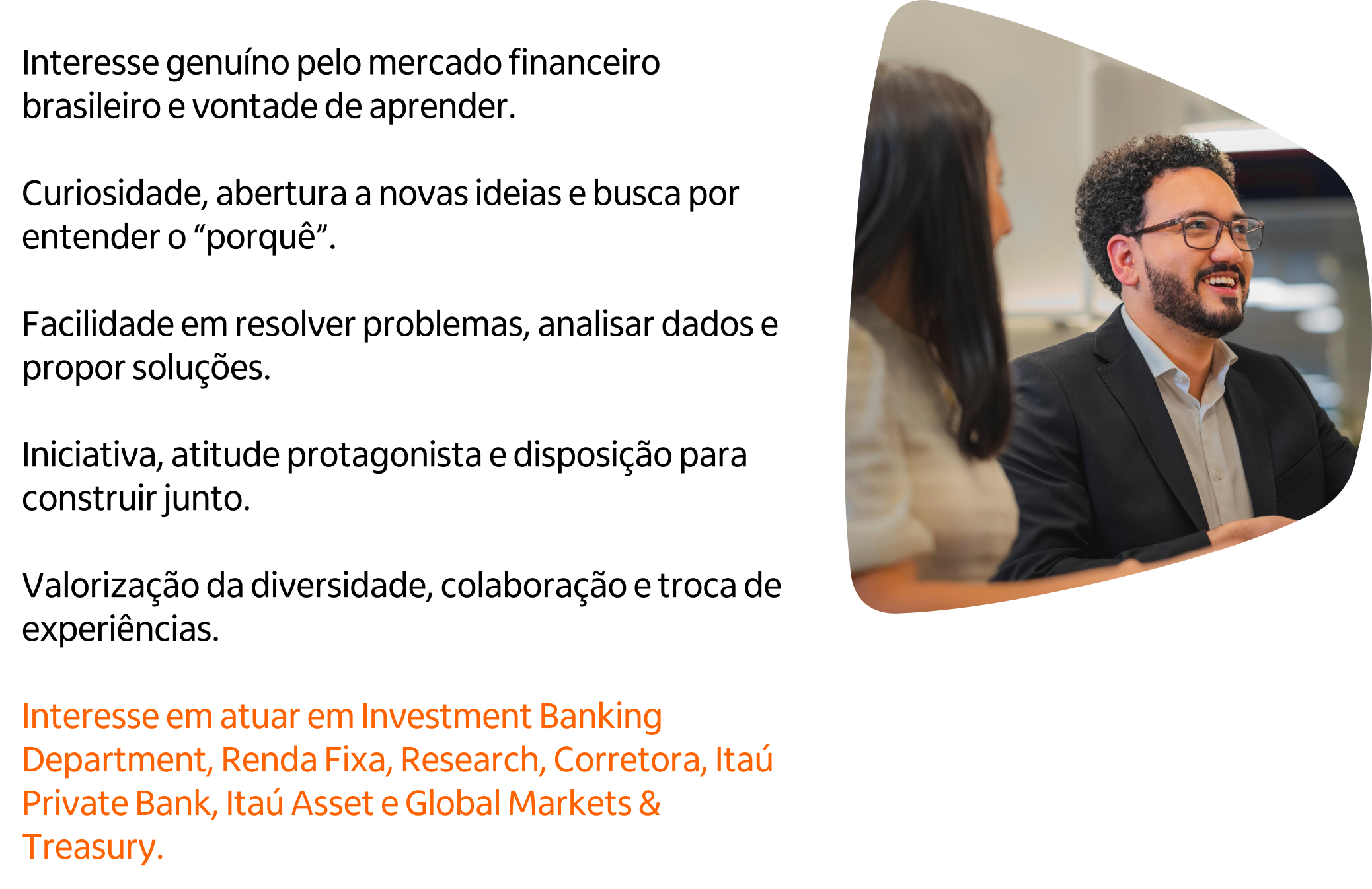 Por trás de cada operação, existe um universo de inteligência e estratégia, onde profissionais ágeis e analíticos têm uma visão privilegiada de como o banco opera, apoiam projetos e contribuem diretamente para o sucesso dos clientes.